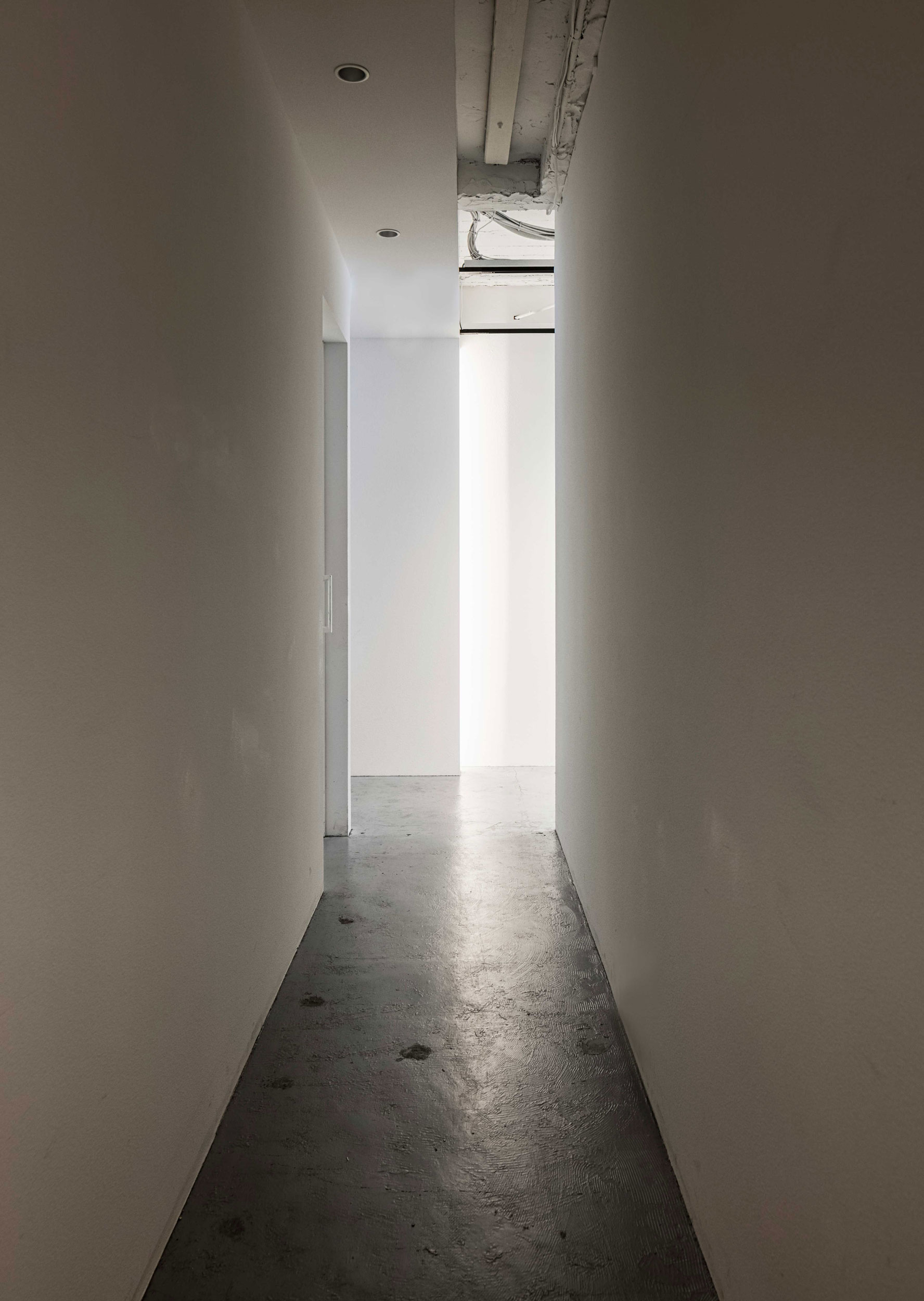オーナーから指示された要望は、天井をスケルトンとしたミニマルデザイン空間とすること。築50年のテナントビル。スケルトンになった内部を見て協議した結果、今のこの状態そのまま残し、極力何も手を加えないこととなった。50年の歴史を包み込むように壁を白く吹付し、多少の凹凸がある床もそのまま塗装した。白一色の空間に唯一配線ダクトとスポットライトは黒にして、メリハリをつけた。