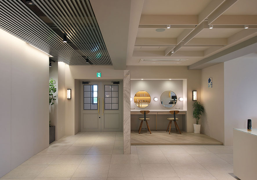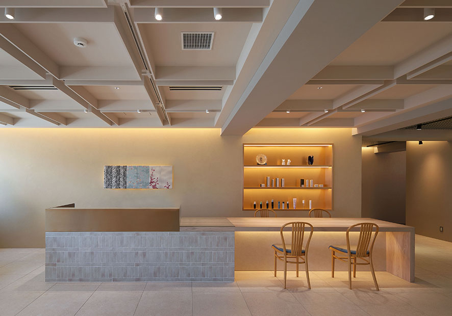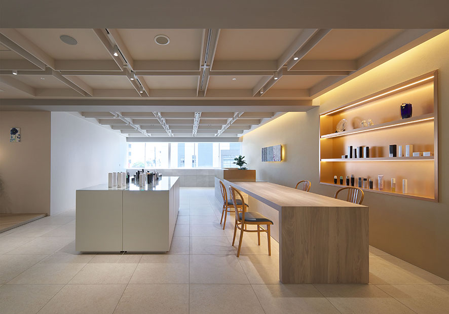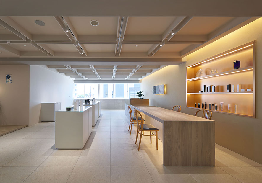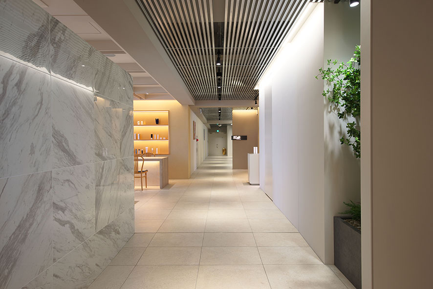 中央の通路・展示スペースを挟んで北側には施術エリア、南側には受付や店販スペースを設けている。各エリアで訪れる楽しさを味わえるように、移動動線や接客スペースの演出を施し、歩きながら様々な物に触れたり香りを感じられる体験を重視した。