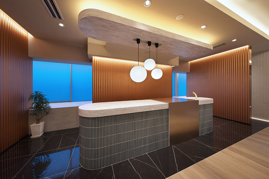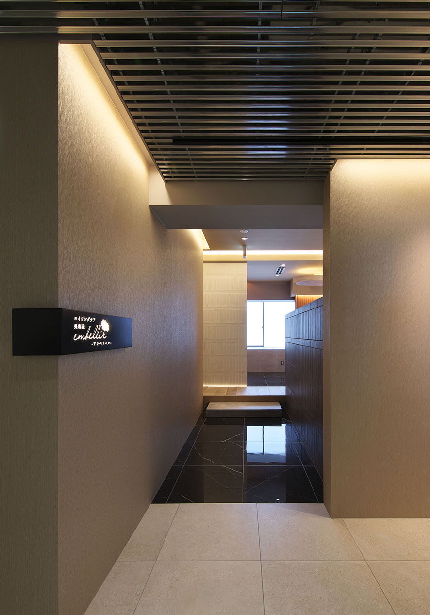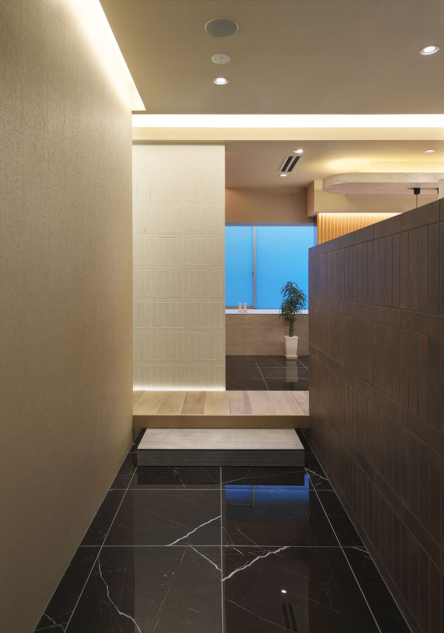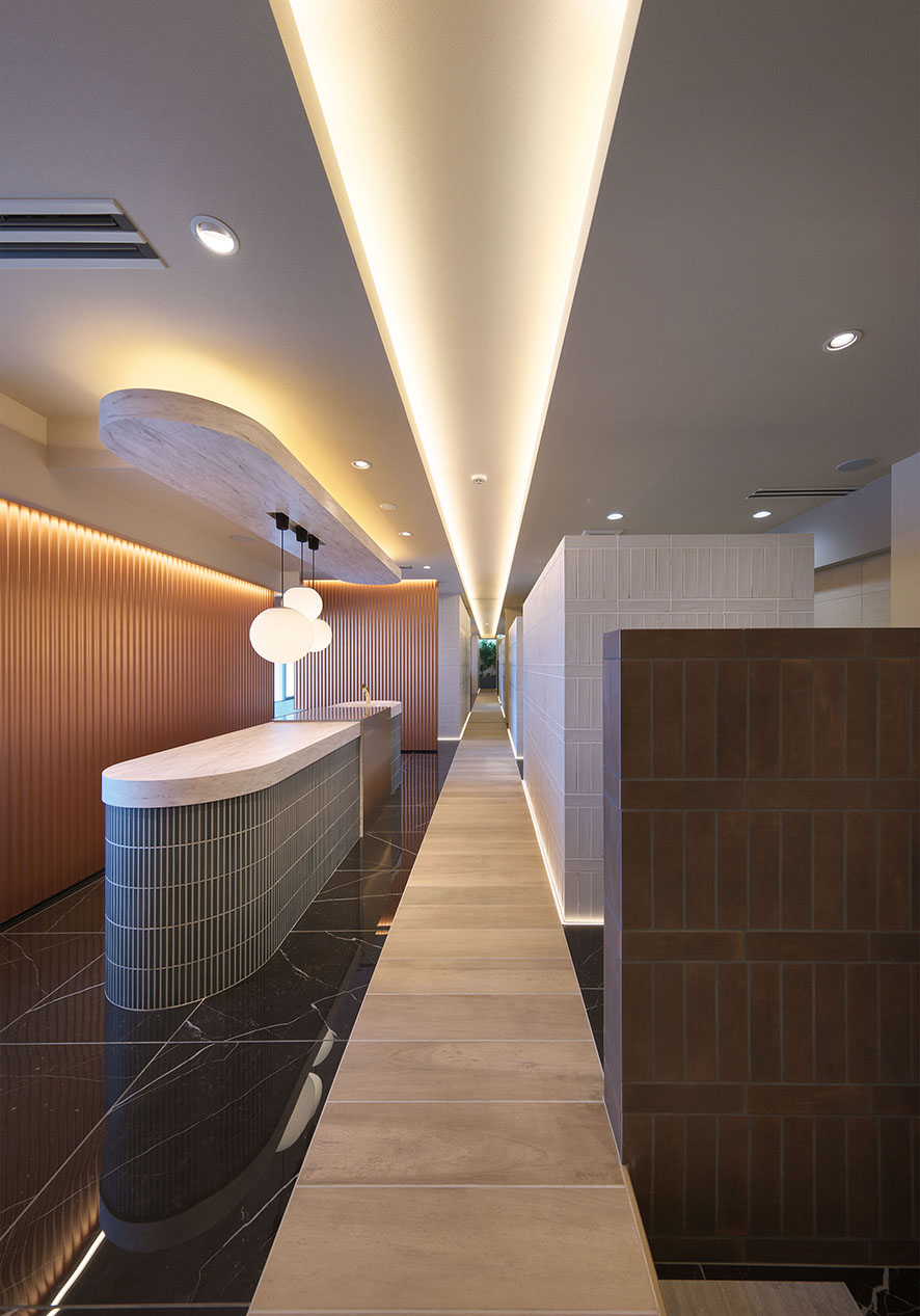 中央の通路・展示スペースを挟んで北側には施術エリア、南側には受付や店販スペースを設けている。各エリアで訪れる楽しさを味わえるように、移動動線や接客スペースの演出を施し、歩きながら様々な物に触れたり香りを感じられる体験を重視した。