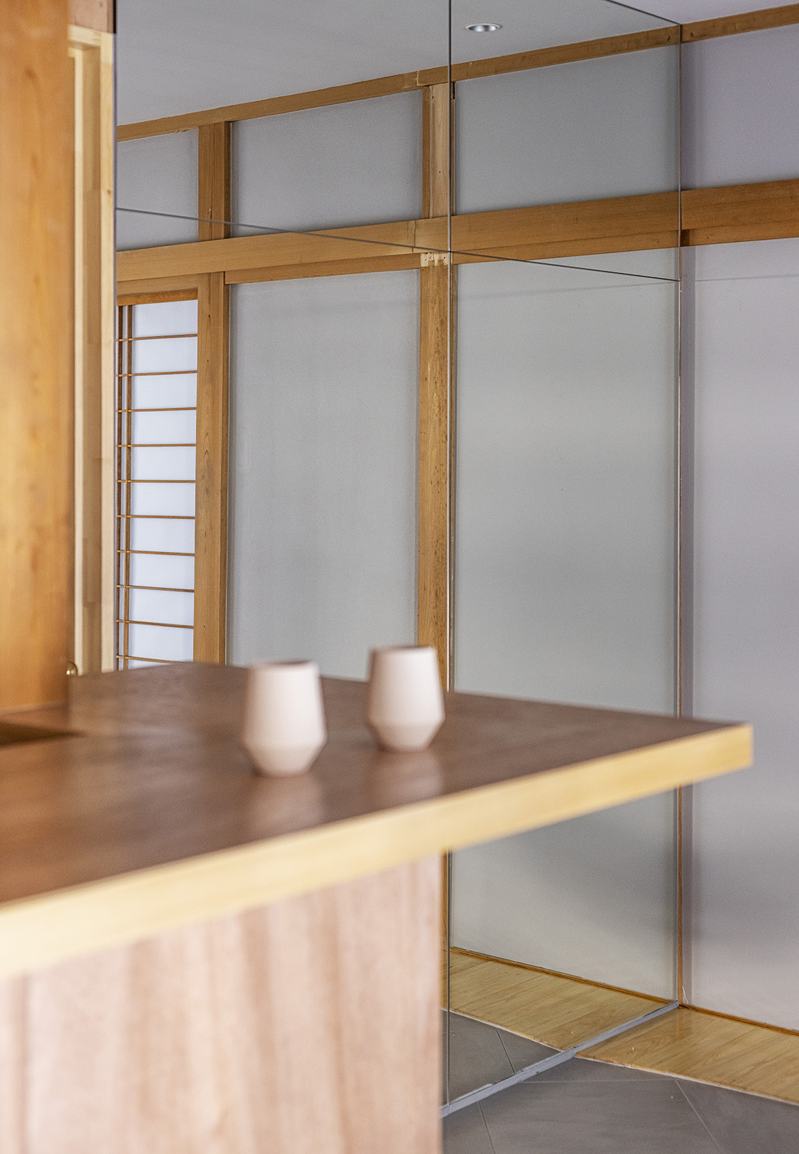 また、店内を囲む長押は、解体させた建材を組み合わせて空間の再構築を狙うと共に、祖母の空間を感じられる。