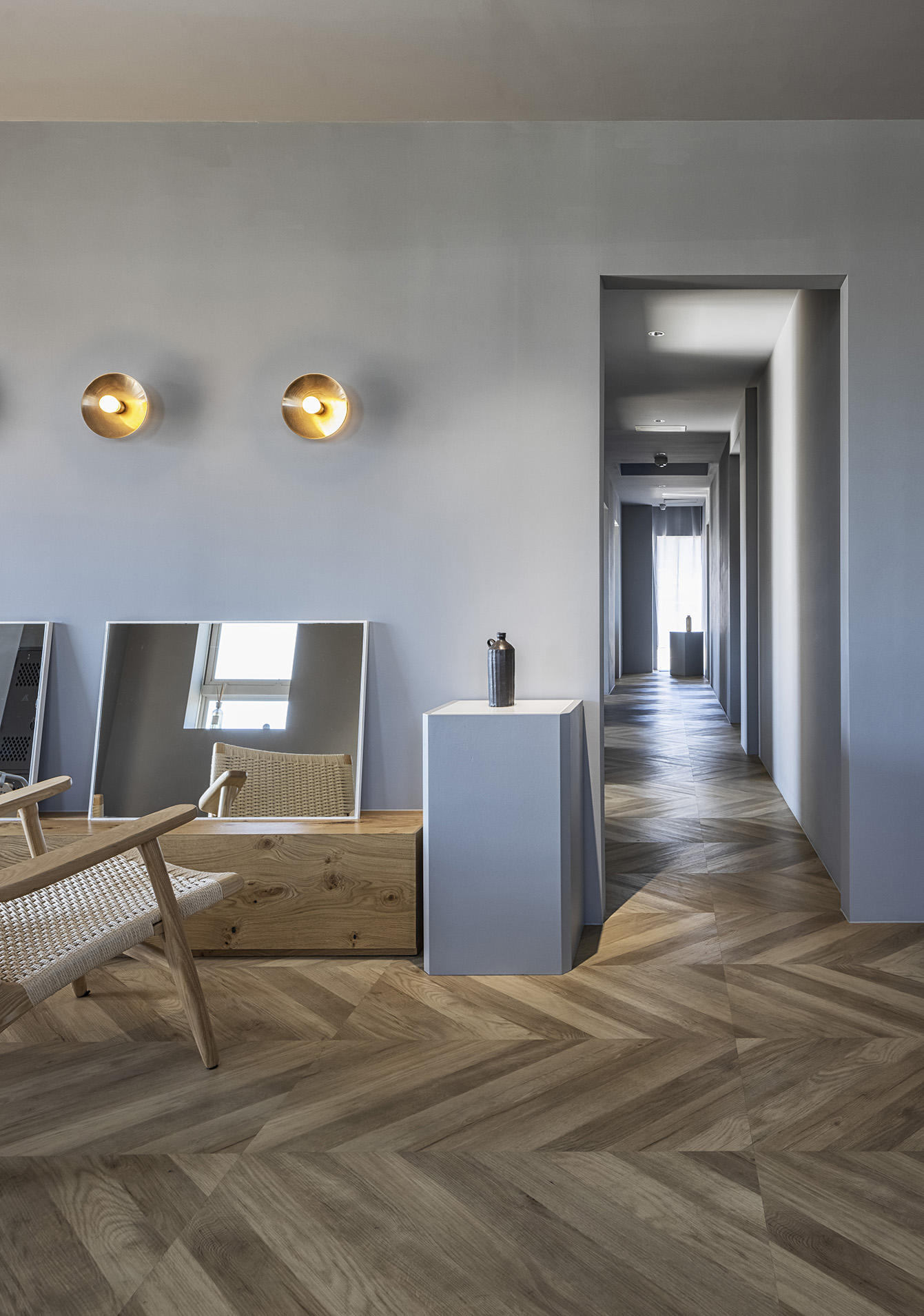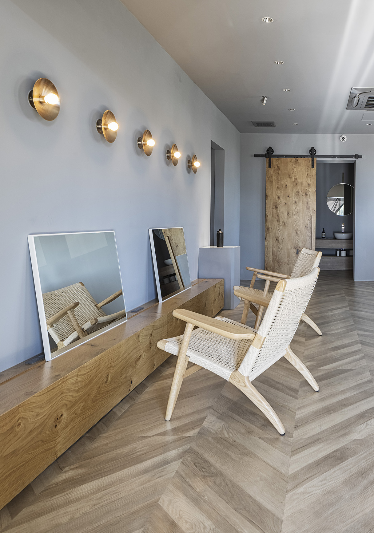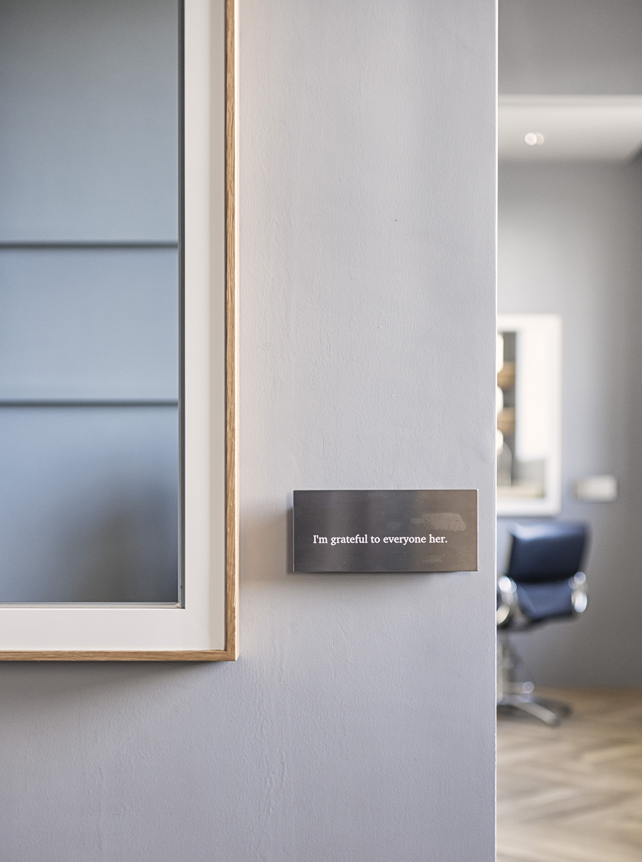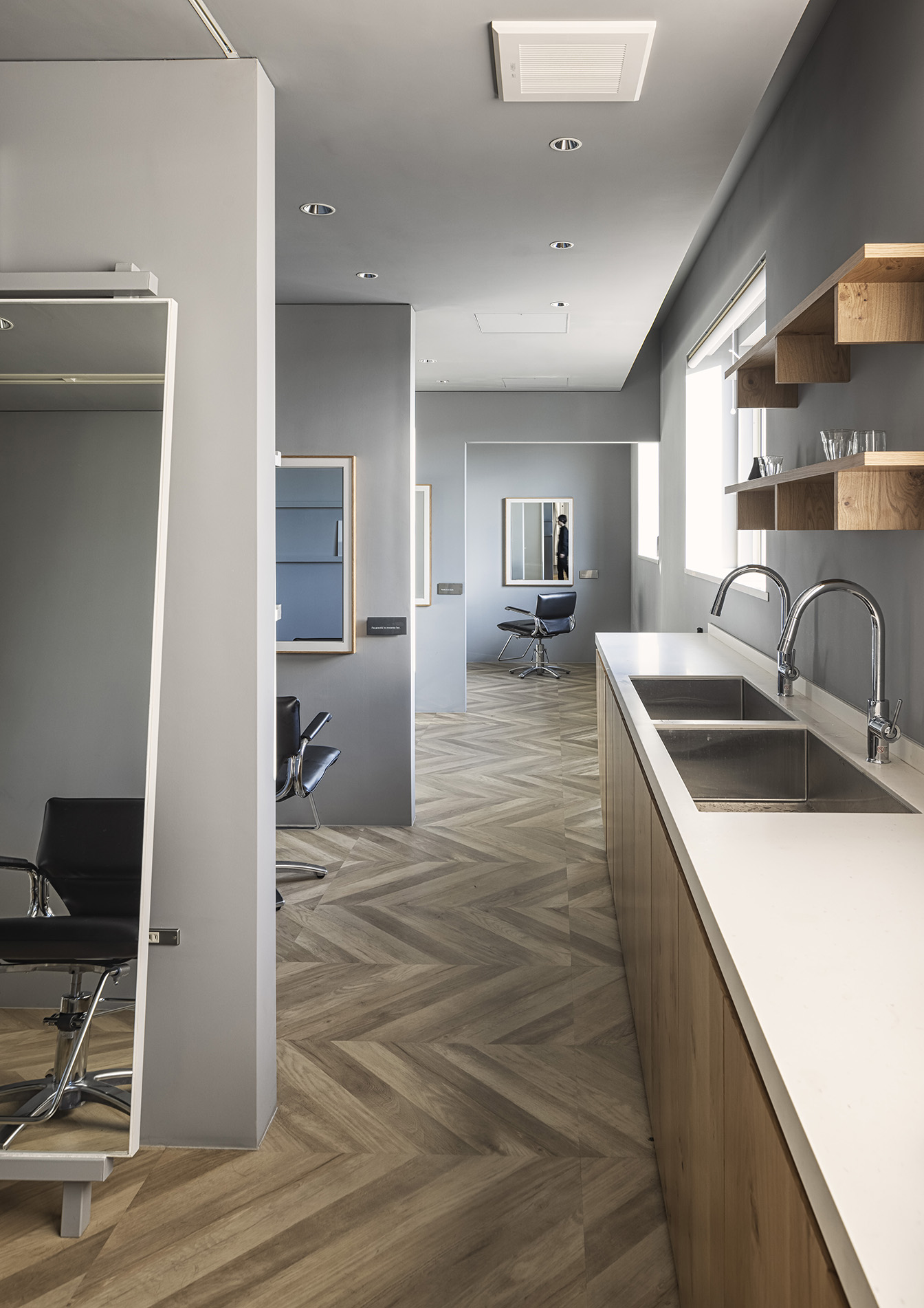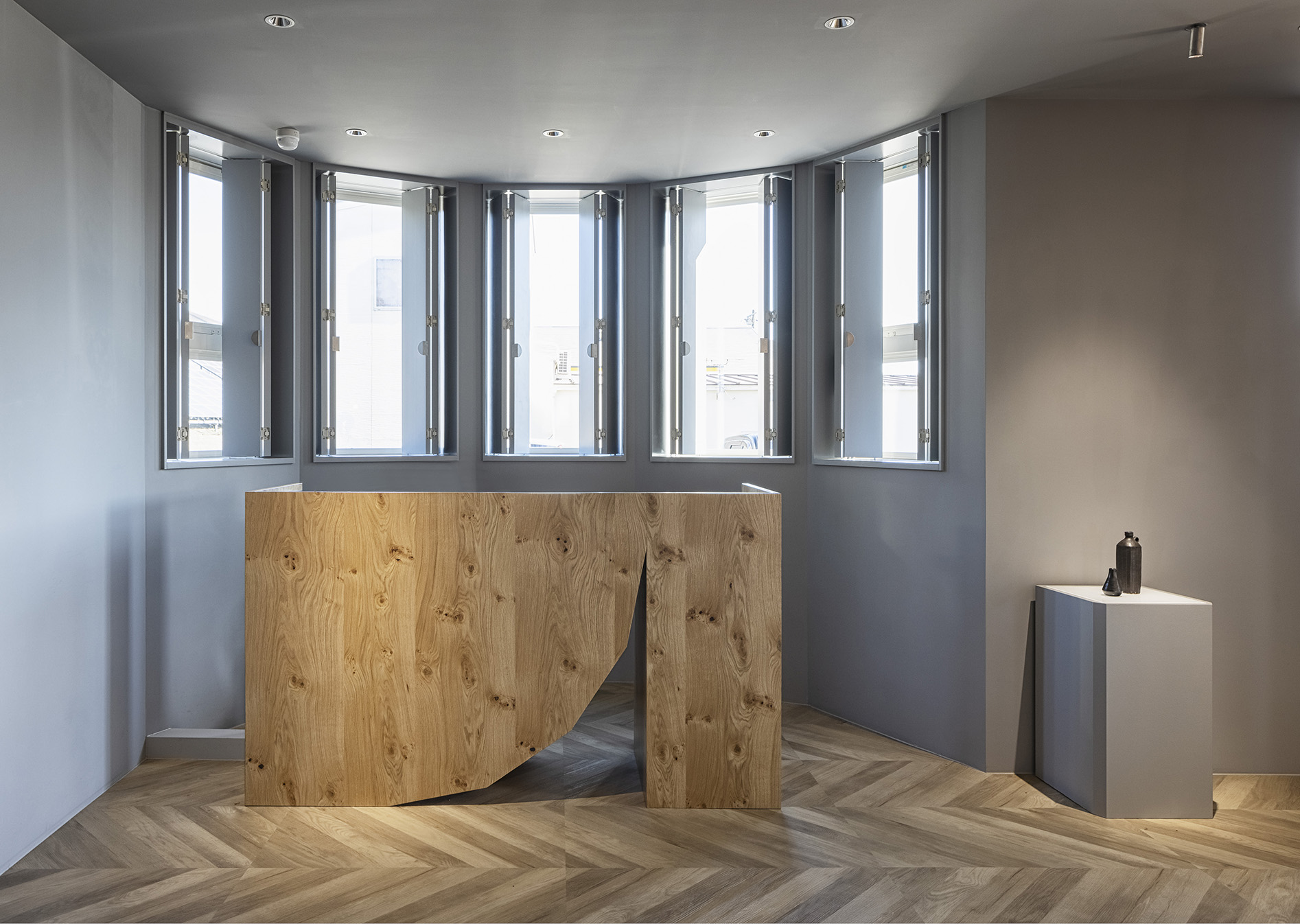 アールの出窓や吹き抜けの天窓などをもつ建物は時が止まったかのような印象があった。この静寂さからインスピレーションを受けアトリエやギャラリーのような空間を設えることにした。美容室はカットやカラーをすることで作品を作り上げていく感覚があるので、アトリエなどと相性が良いとも考えた。素材は主に家具に節目のあるオーク材やコーリアン、床にヘリンボーン材、壁に灰色の塗装を施している。また、光量を調整する操作や壁面にリブなどで凹凸をつける事で陰影を印象付け、静けさに寄与させている。お客様にどこか物懐かしさや静寂さを感じてもらい結果的にこれらが居心地の良さに繋がれば幸いである。