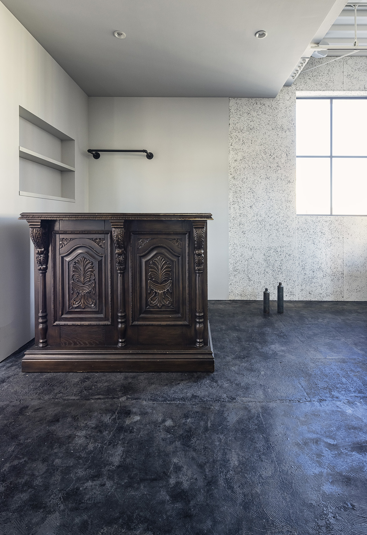 排水位置が水回りから遠く、しかし床上げ面積を減らしたいため配管BOXをH鋼に見立ててデザインし、逆梁のような構造で見せている。また、シャンプースペースとスタッフルームを隔てている壁を木軸で組み、舞台のセット裏をあえて見せ、未完成な状態とした。