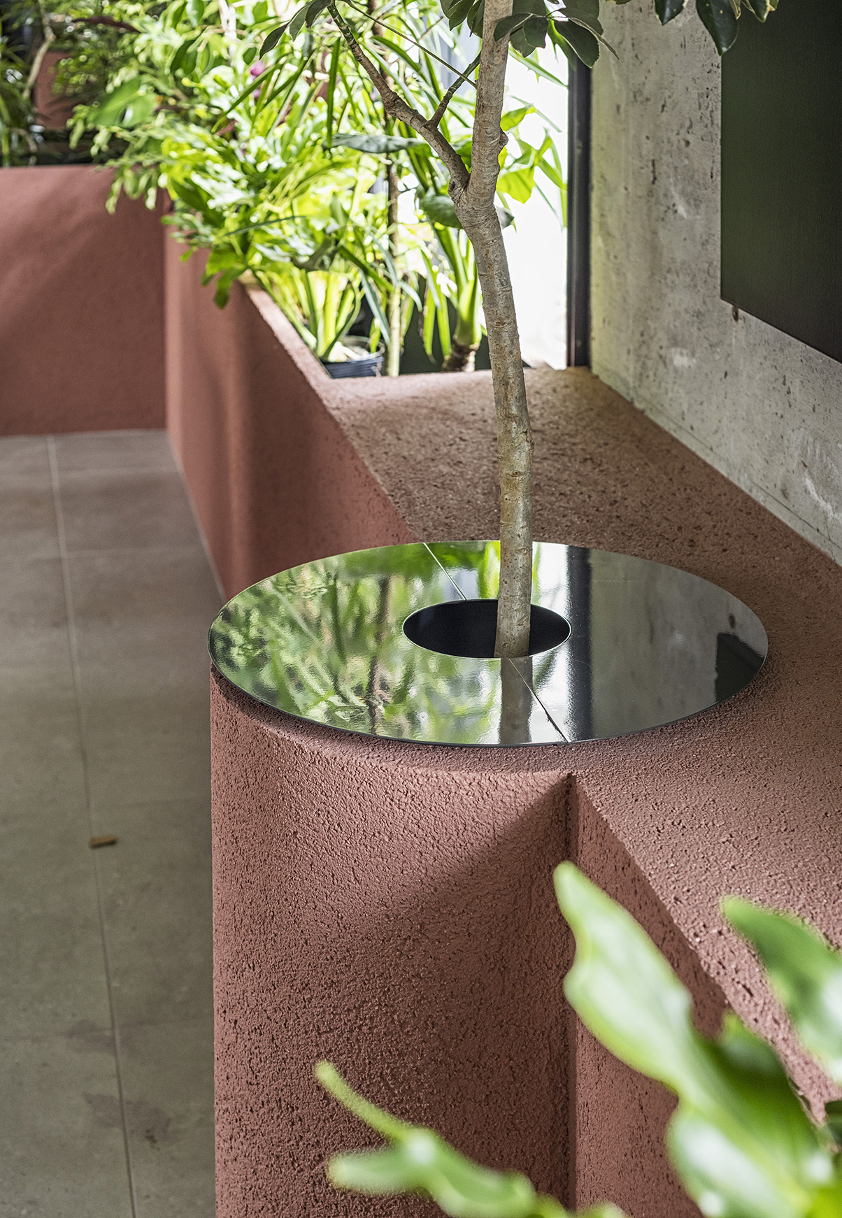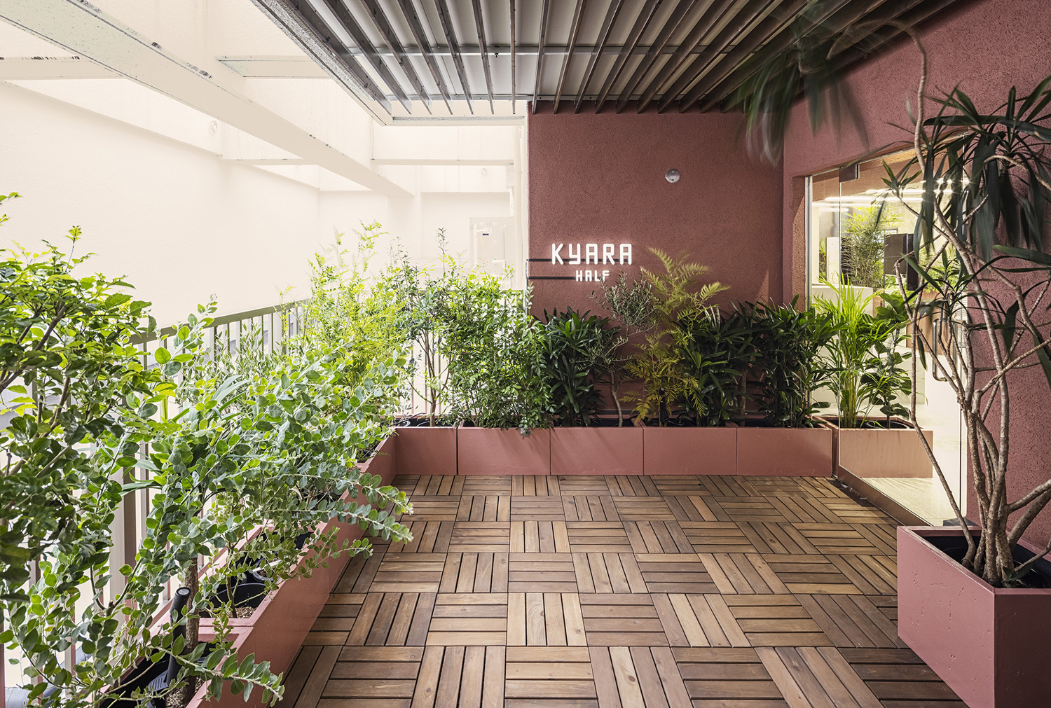 計画地は南池袋公園目の前のテナントビル7階にあるペントハウスである。室内からは南池袋公園側に開けており、市役所まで高い建物がなく大きく空が見える気持ちの良い空間であった。7Fのエレベーターを降りると、一度屋根のある気持ちの良い屋外に出て、店舗の入口が現れる特徴的なテナントでもあった。この立地のメリットを最大限に活かすために、店舗入口の半屋外空間の気持ちよさをそのまま室内まで取り込み、池袋の喧騒の中で現れるオアシスのような空間にしたいと考えた。