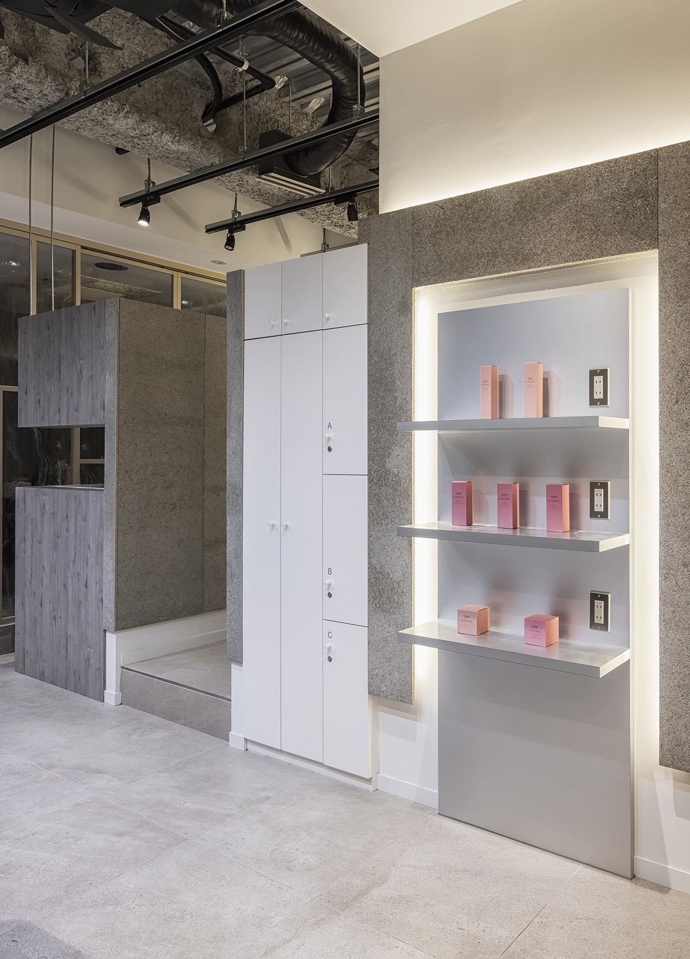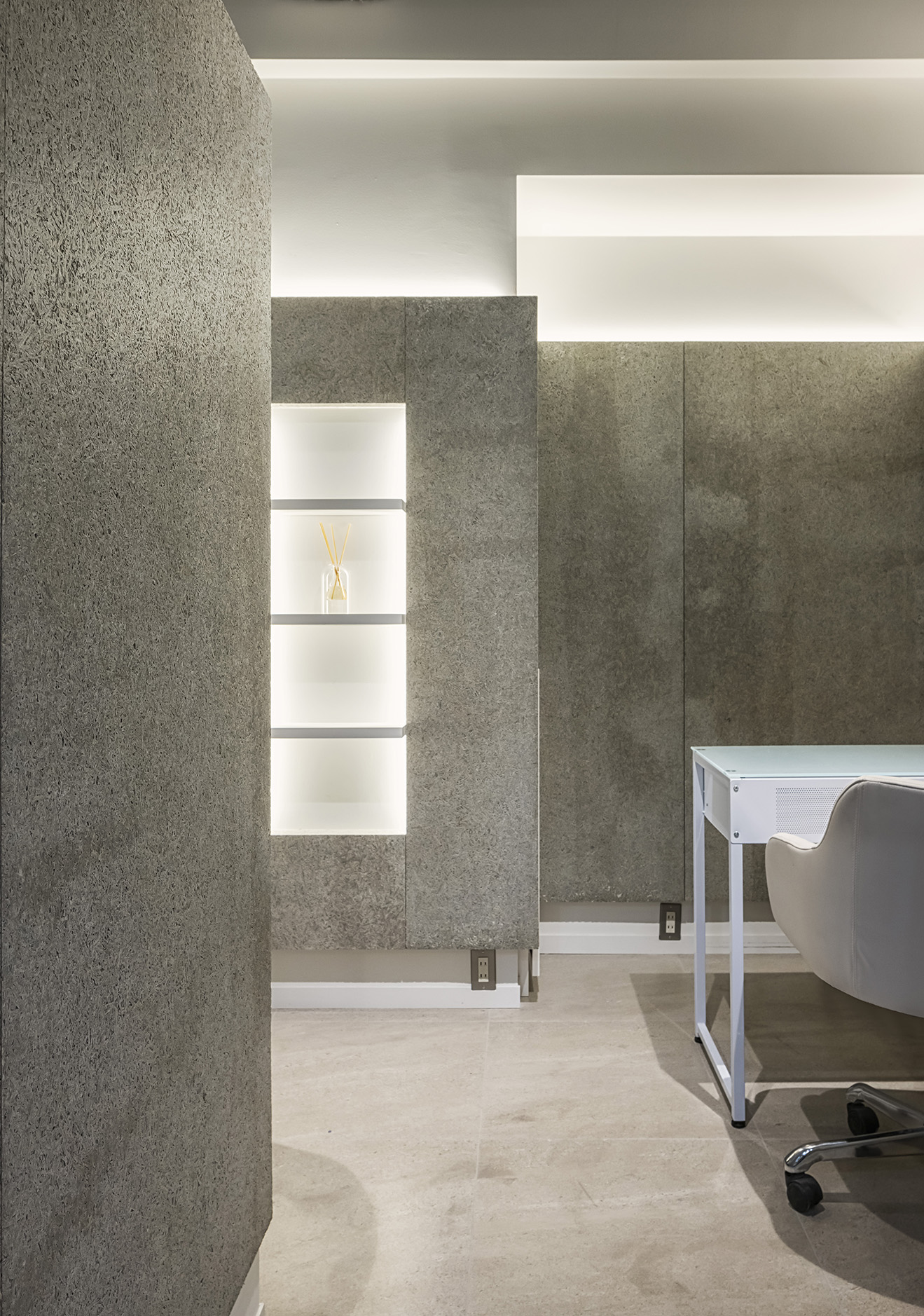 床は大判の磁器タイル、壁には木毛セメント板を採用。全体的に間接照明を施し、モノトーンでありながら優しく温かみのある空間とした。既存のセットミラーや受付カウンターは流用し、コストパフォーマンスも実現させた。