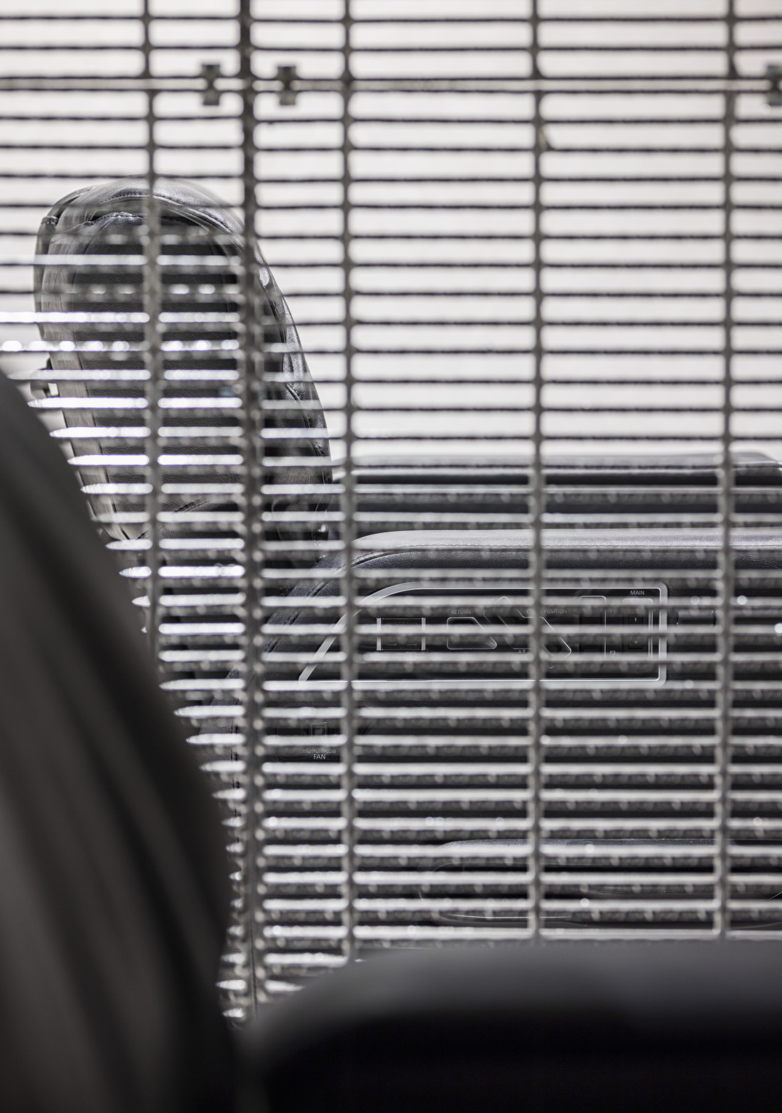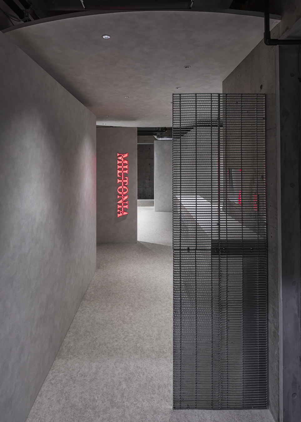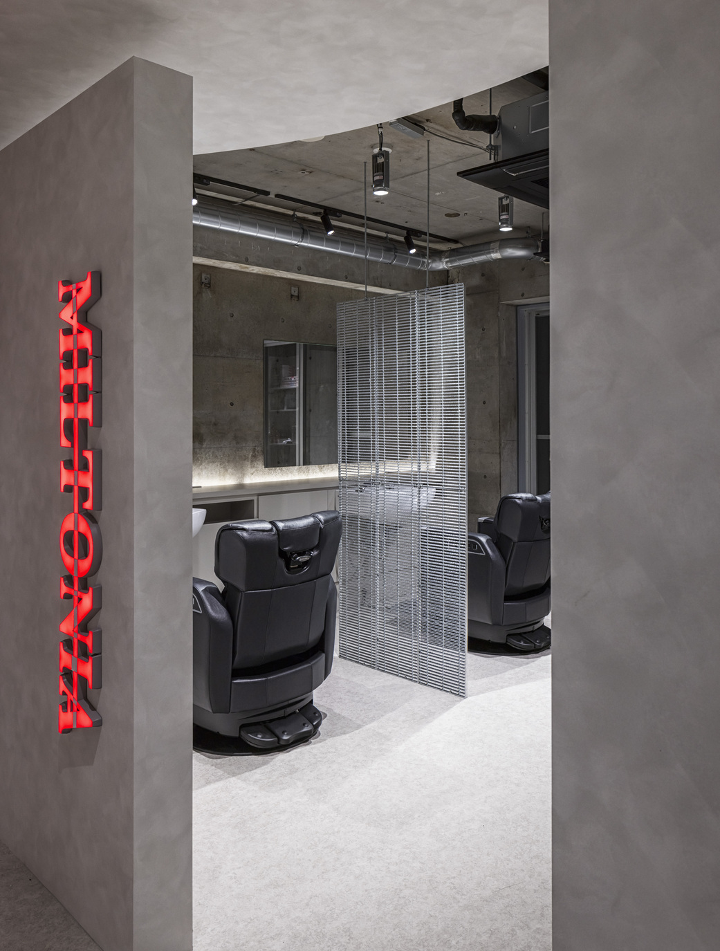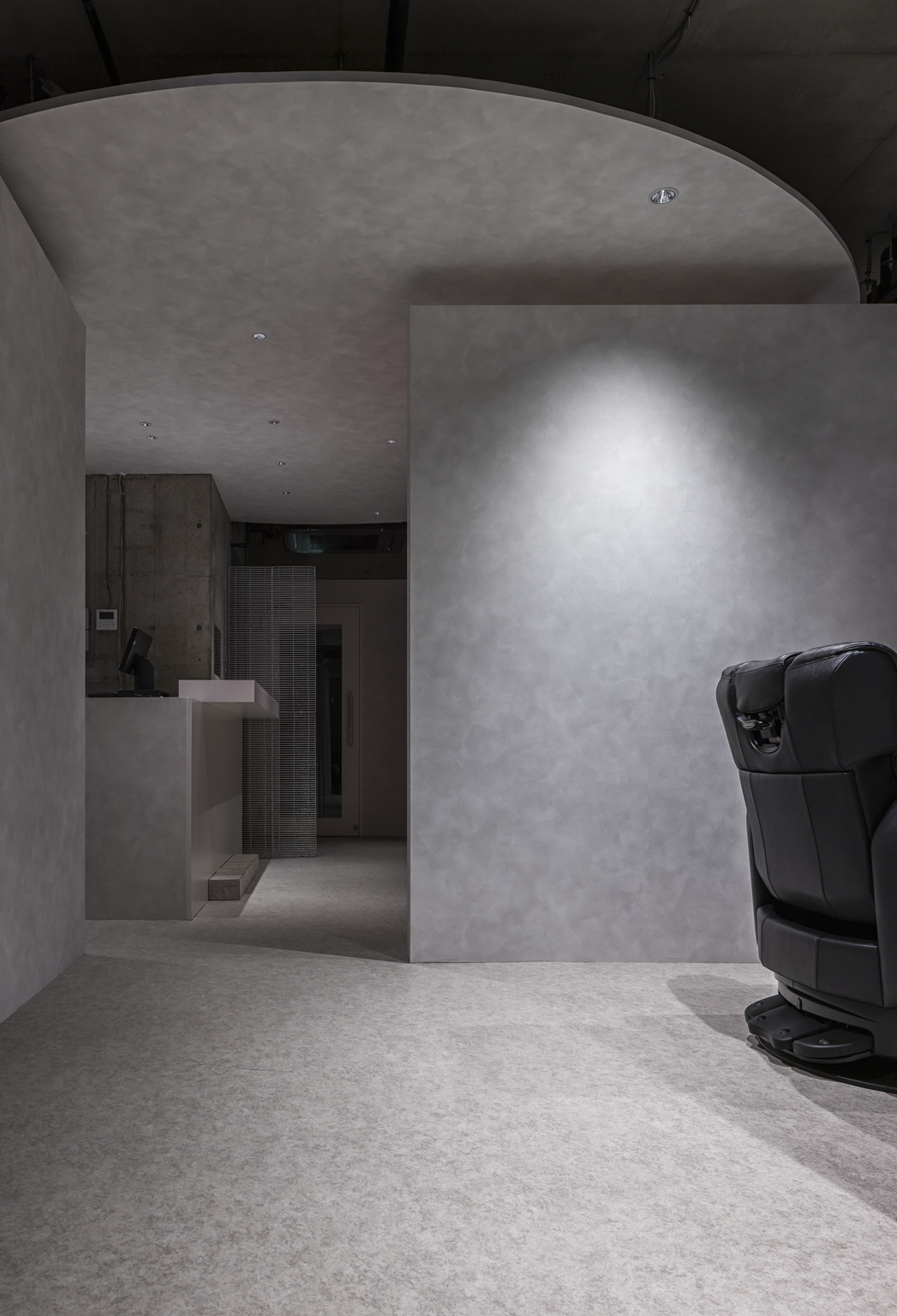 他の客と顔を合せないように配慮したエステブース、バーカウンターのような受付、半個室のスタイリング空間で構成されている。「個室による閉鎖感」を解消するため、各部屋を跨るように天井に大きな「図形」を取付け、空間の広がりを感じられるようにした。また、男性的な印象に偏らないよう、丸みや透明感のある素材を取り入れ、中性的な印象になるようまとめている。