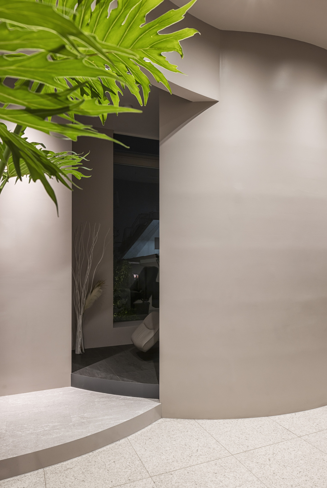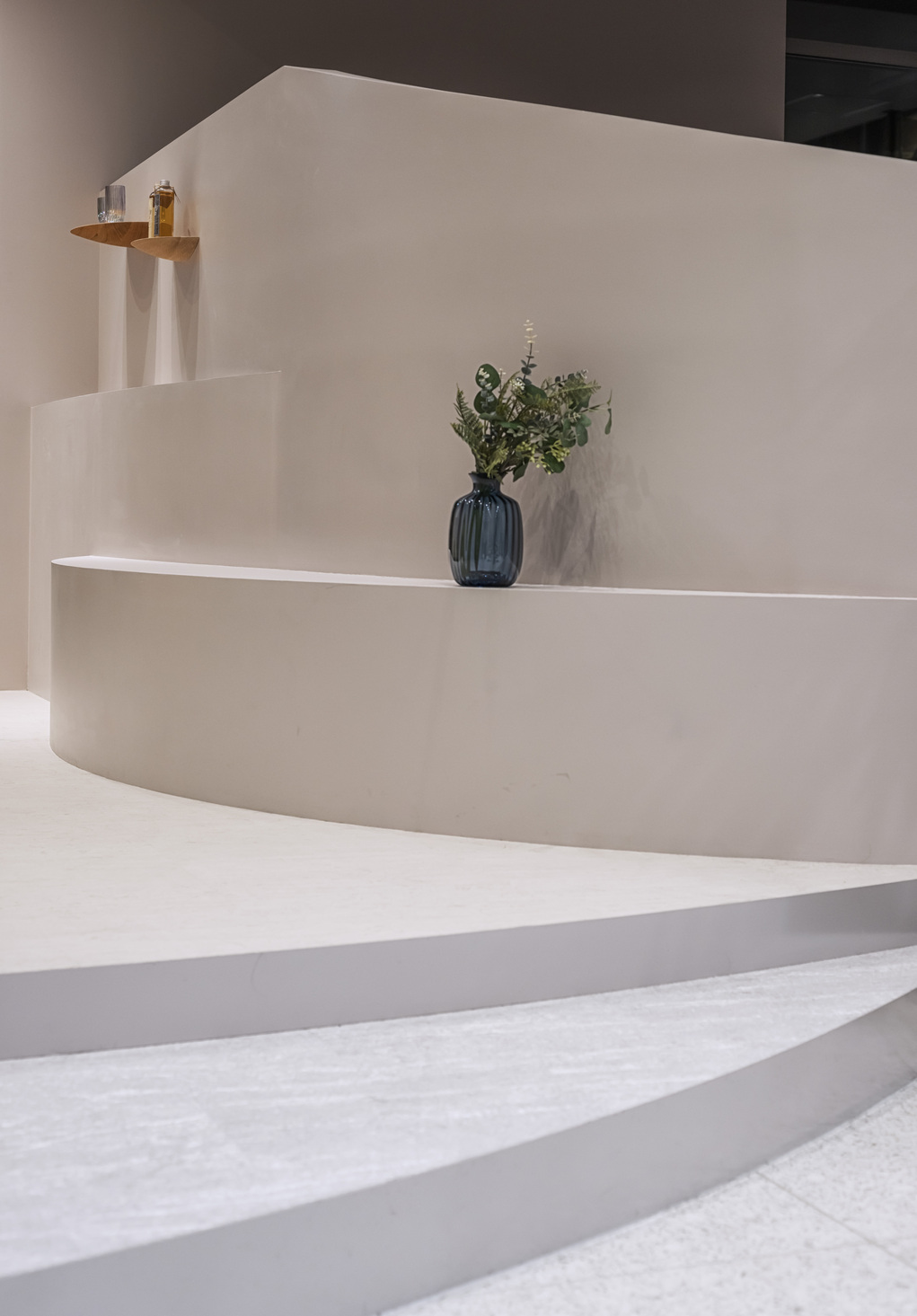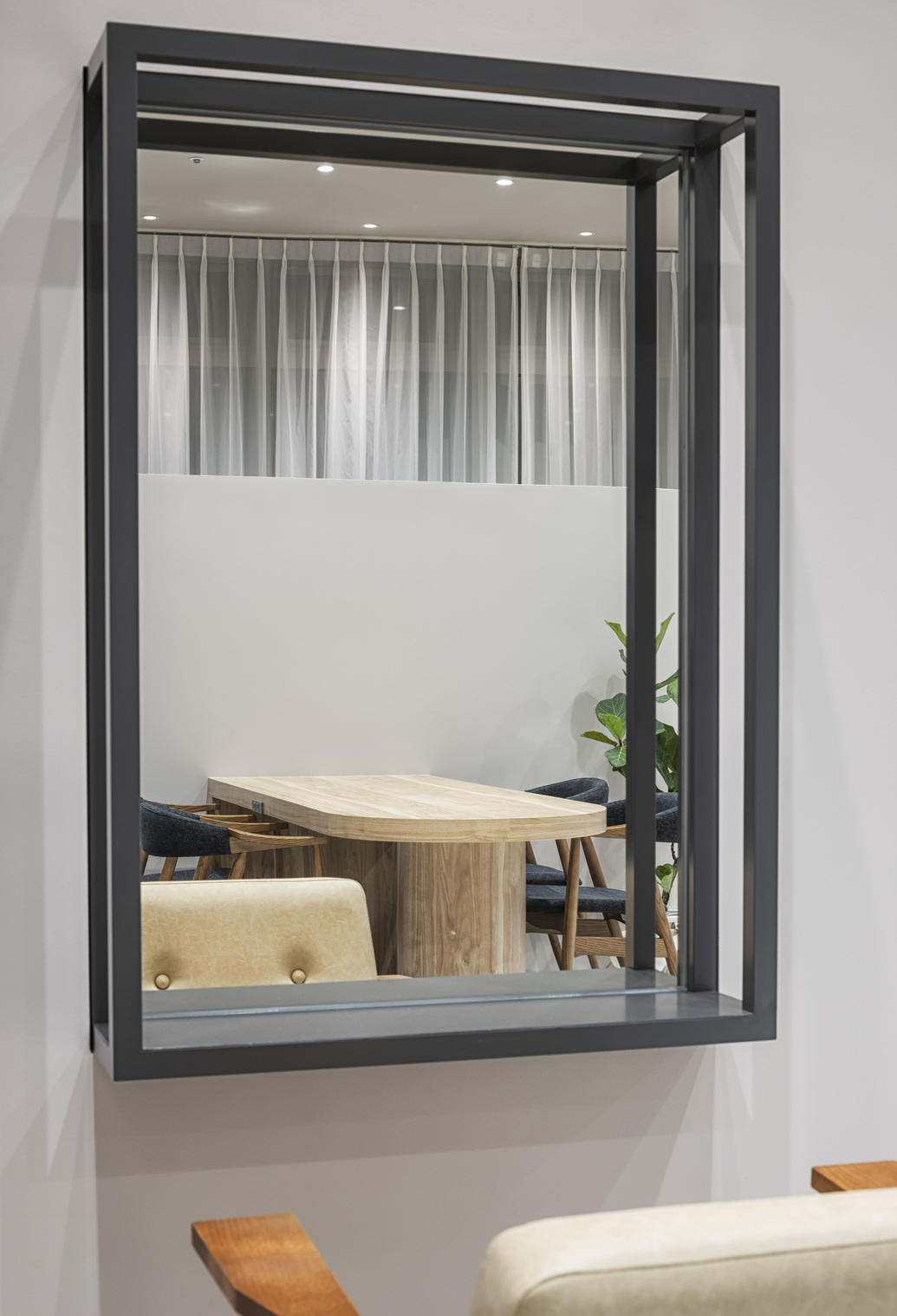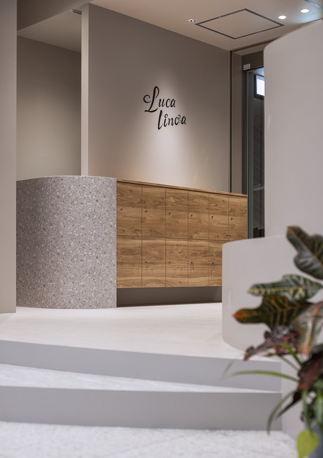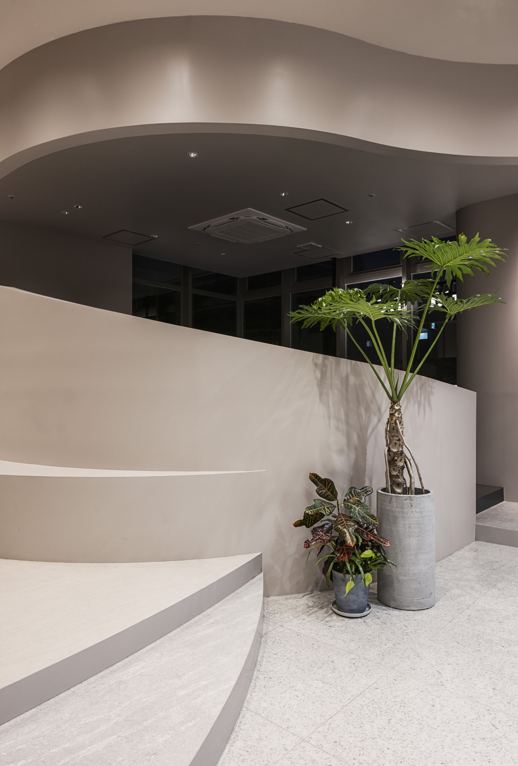 本区画は2階の角に位置し、大きな3面採光のテナントであった。窓面の開口に合わせ、柱型をRの壁で囲うことで有機的な印象を作り、角パイプを使用したセット面の家具と砂地のような床タイルで公園のような開けた気持ちのいい空間になることを意識した。