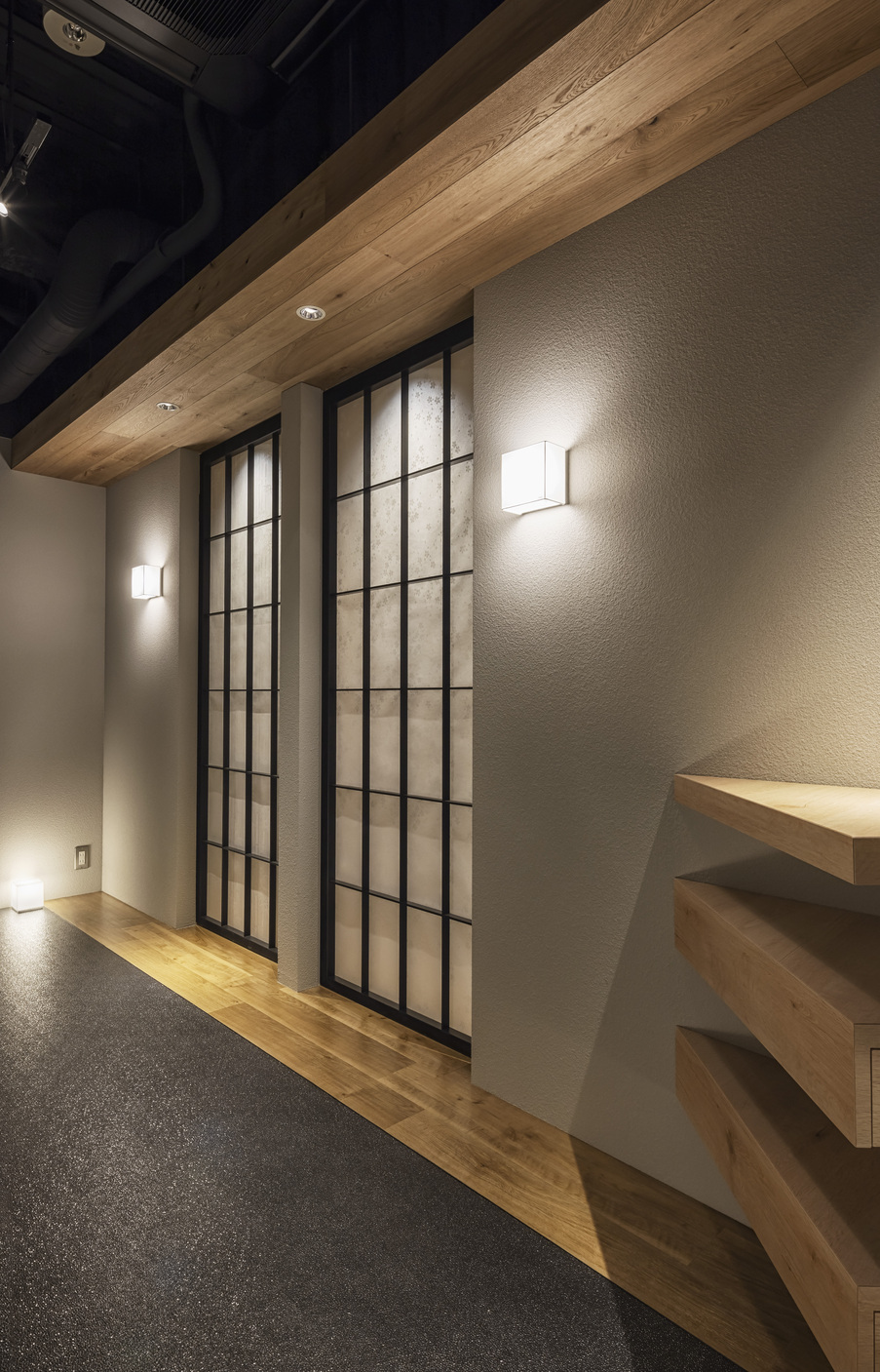 施主からの要望は、ターゲットの訪日外国人に対して、日本文化を体験できる和の空間にすることであった。そこで提案したデザインコンセプトは屋形船。通路を川に見立て、足元に照明を配し川に浮かせ灯籠流しのように演出した。また、屋形船船内の床材は畳調塩ビタイルを選択。スケルトン天井は夜空に見立てて黒く塗装した。
