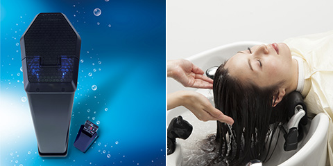「YUME HEADBATH」を使⽤した「頭浸浴」。 ヘッドスパやカラーケアの価値を⾼める新体感メニューは、炭酸との組み合わせもおすすめです。