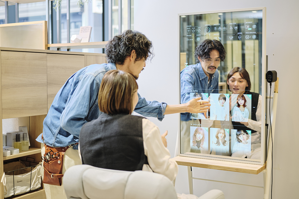 ミラー上では、AIを用いた「顔分析」「カラーシミュレーション」で新たな自分のスタイルを発見することも。また、理美容師が顧客の好みに合わせて「マイフォルダ」から自身のポートフォリオを照会することもできるため、理美容師自身の得意も引き出し、自信をもって提案することができます。 - さりげないきっかけを生み出す