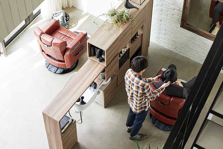 間仕切り家具と、2面で使えるシャンプーボウルがセットになったシャンプーユニット。置くだけで居心地の良さと使いやすさを両立するセミプライベートルームが完成します。