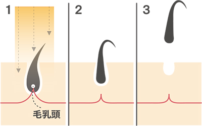 光を照射し、毛に栄養を届ける役割をもつ「毛乳頭」に働きかけます。数日後、毛が抜け落ちて毛穴が収縮。これを繰り返すことで、細く薄い毛へと変化していきます。