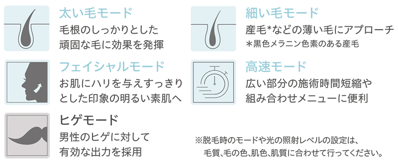 高性能な光照射&豊富な脱毛モードで、あらゆる毛質に効果的にアプローチ!